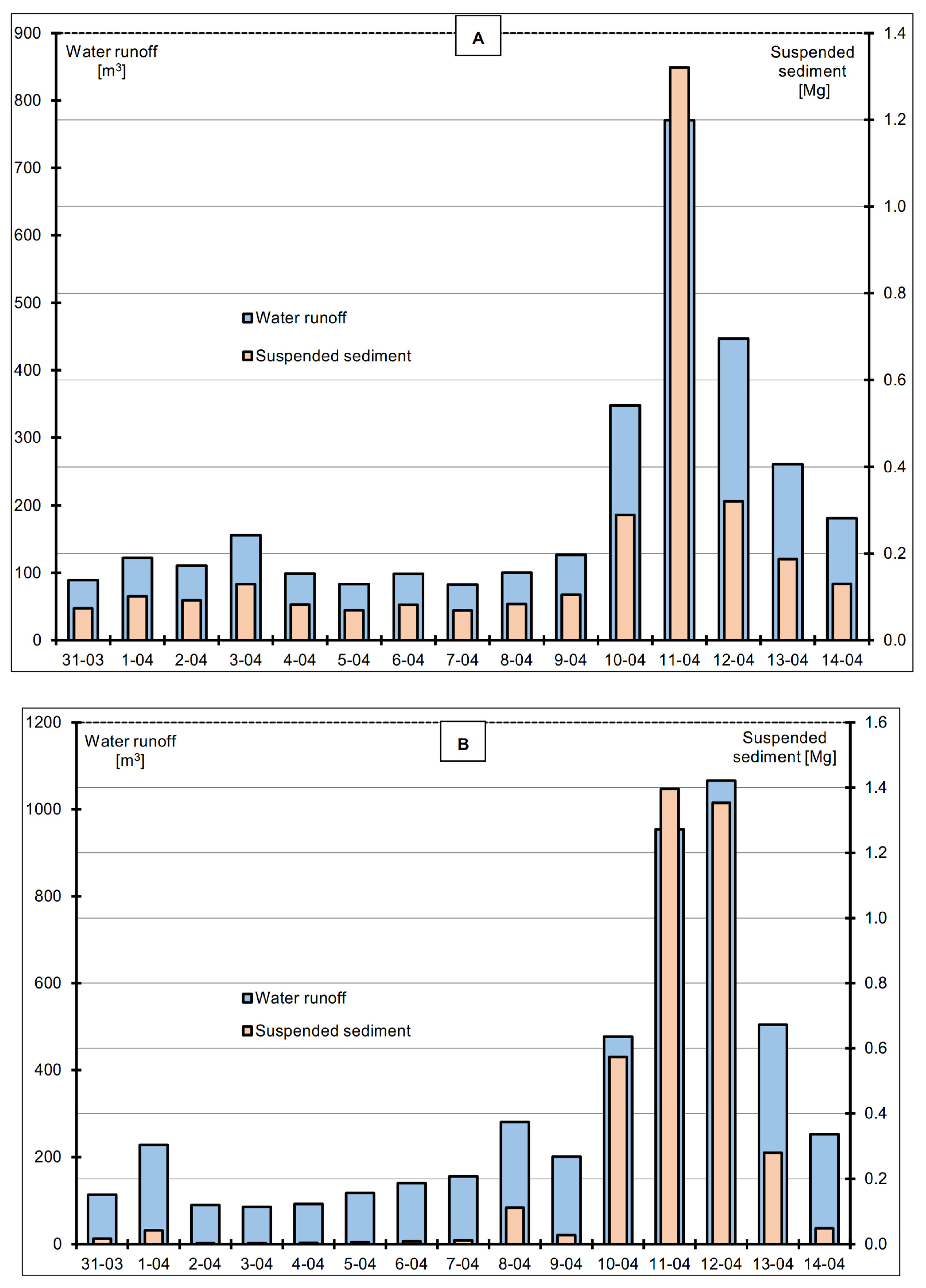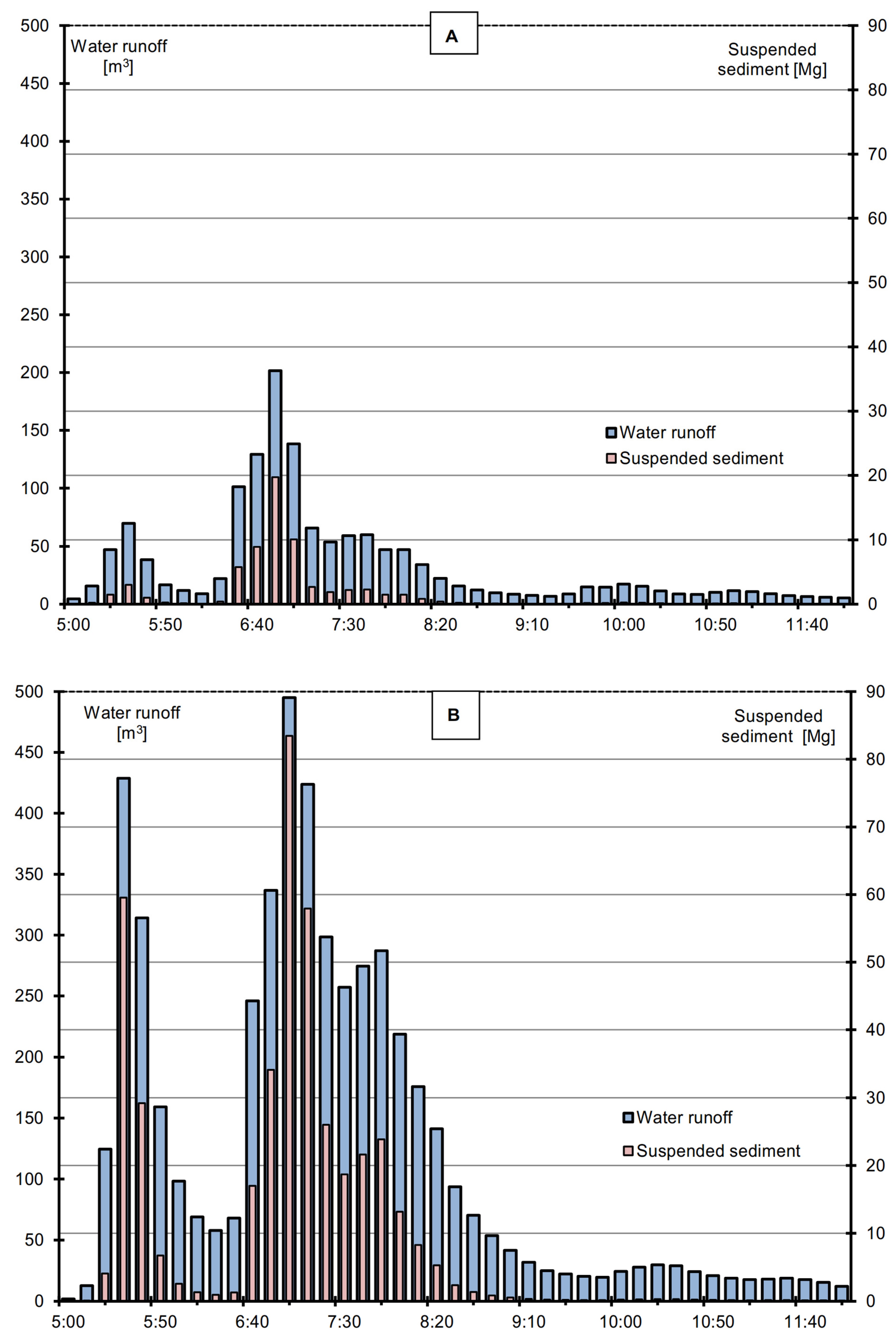 The subsequent increase in the suspended sediment yield resulted from the development of slope runoff and the increased supply of material from soil erosion on the watershed. At the lower overflow, the maximum suspended sediment yield coincided with the peak in water discharge, which confirmed long-range sediment transport from the slope catchment area. On the other hand, the more than twofold increase in suspended sediment yield at the lower overflow confirmed the increased share of material originating from the cutting of the gully bottom.