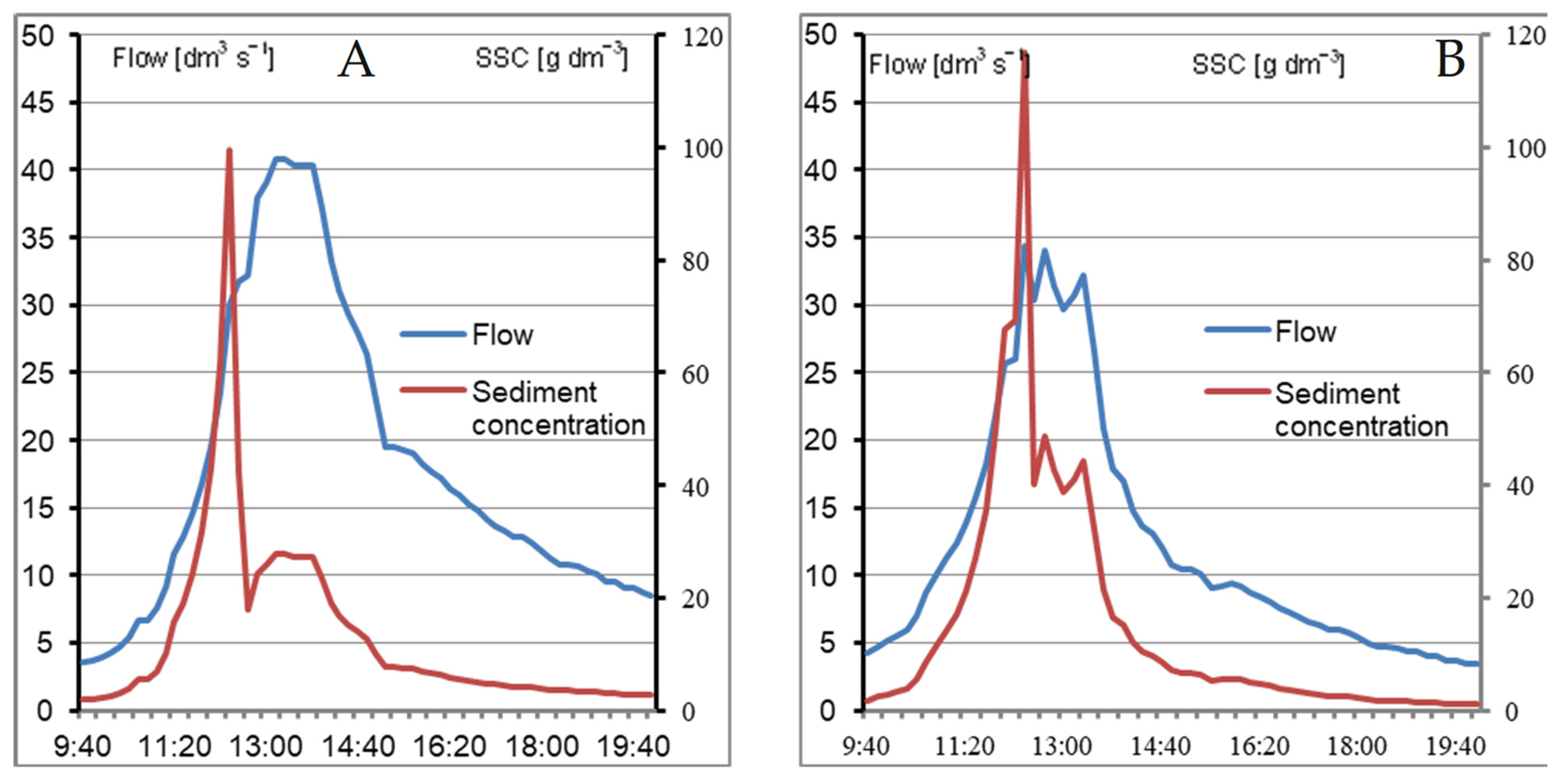 At the upper overflow, the maximum concentration of suspended sediment occurred after a 10 min delay. This can be linked to the lack (exhaustion) of available material in the slope subcatchment area, which was carried away during the previous downpour. In contrast, at the lower overflow, the maximum concentration of suspended sediment occurred simultaneously with the peak flow, which indicates that there was a supply of slope material (long-distance transport). On the other hand, a more than fourfold increase in suspended sediment concentration occurred as a result of increased erosion of the ‘underloaded’ stream, which could have intensively cut into the bottom of the main gully.