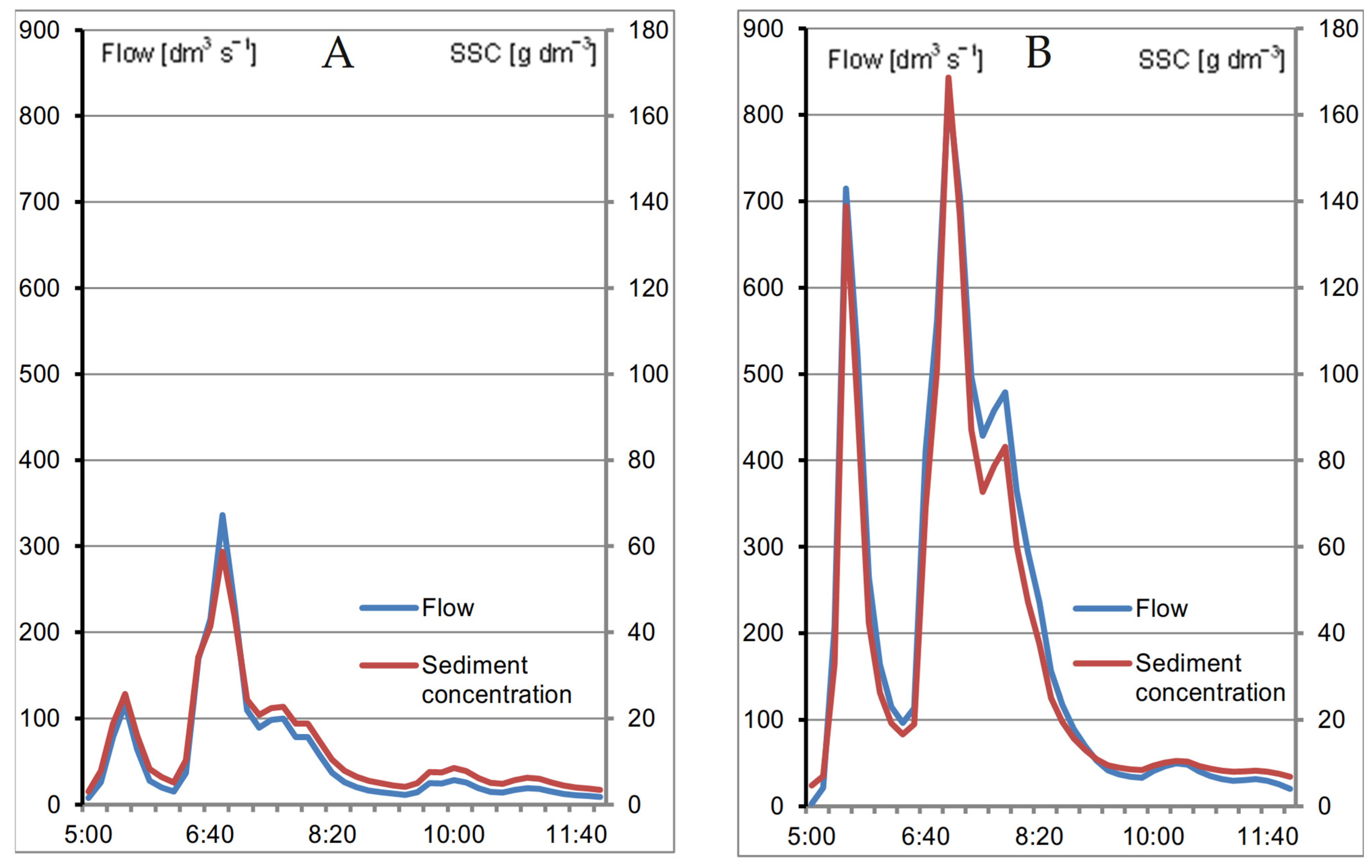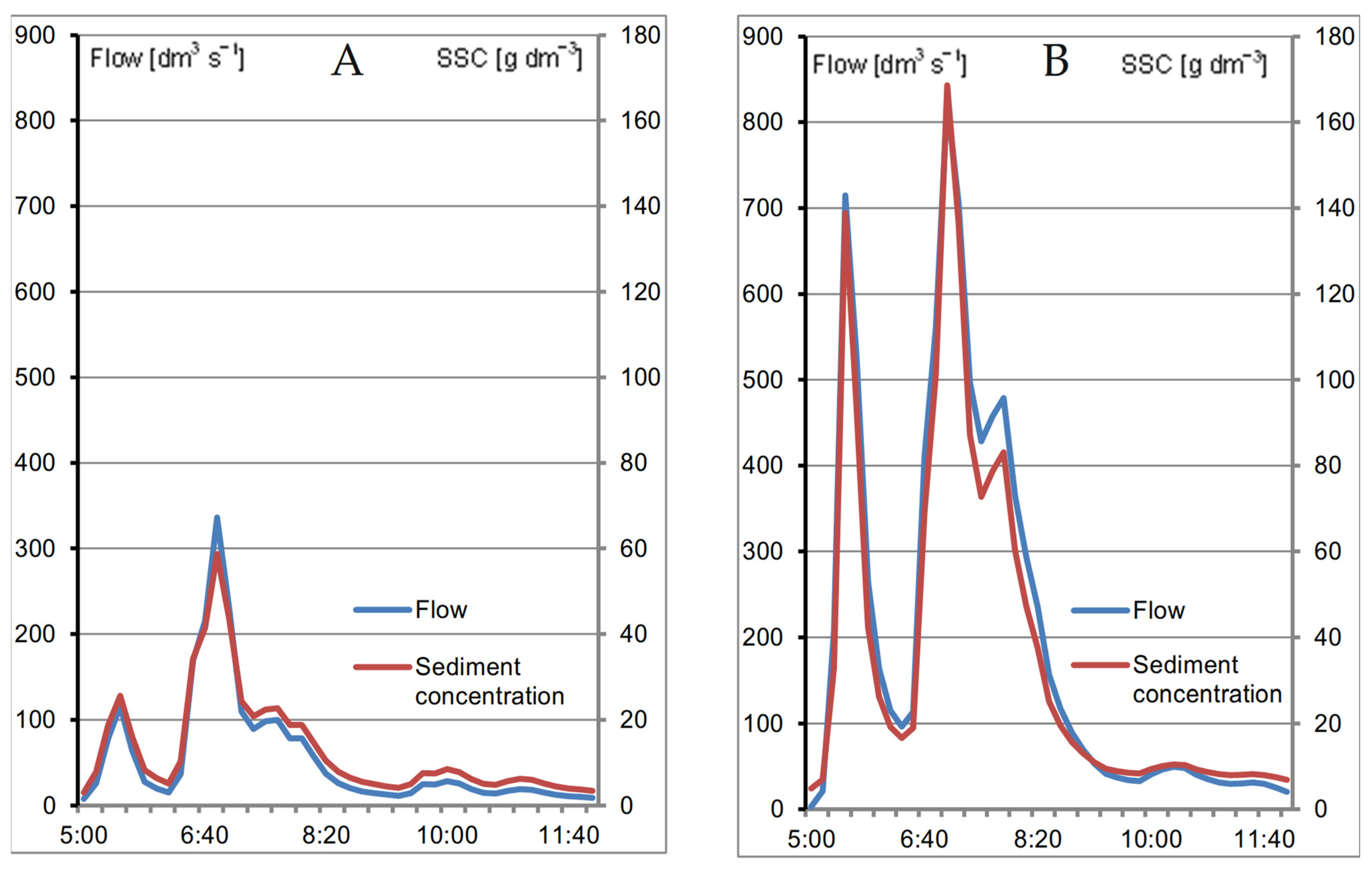 The course of the water flow and suspended sediment yield on 23 June 2013 in the Kolonia Celejów gully catchment area differed from those of the previous June downpour (Figure 15A,B). The maximum discharge intensity was also more than twice as high here. However, the suspended sediment yield in both overflows was synchronised. In the upper overflow, the maximum suspended sediment yield was recorded 10 min after the peak water discharge. This delay can be explained by the depletion of the available capacity to transport slope material, which had been removed during the previous rainfall.