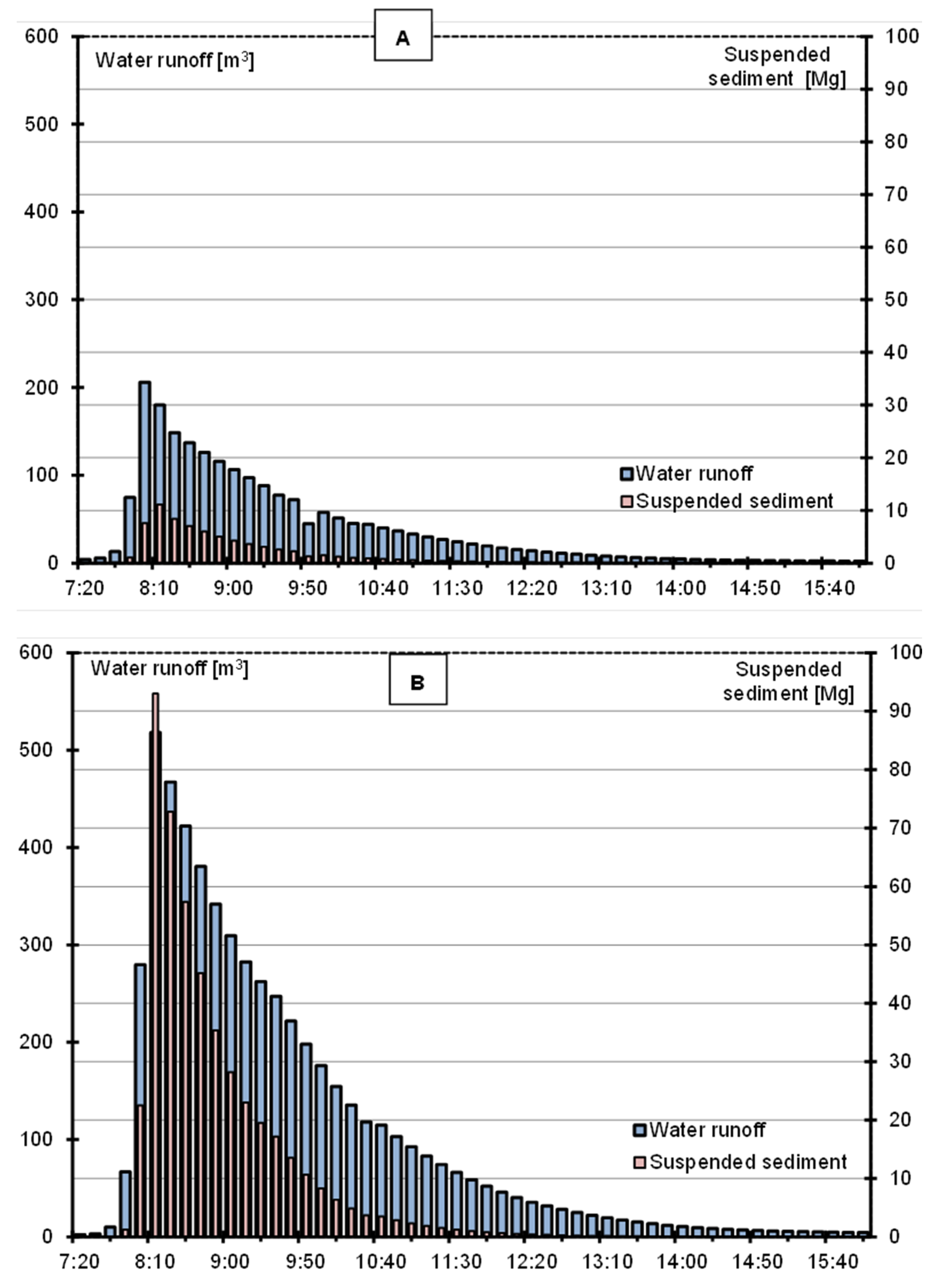 Figure 15. Outflow of water and suspended sediment from the gully catchment during the downpour of 23 June 2013: upper (A) and lower (B) overflows. Times given in UTM time.