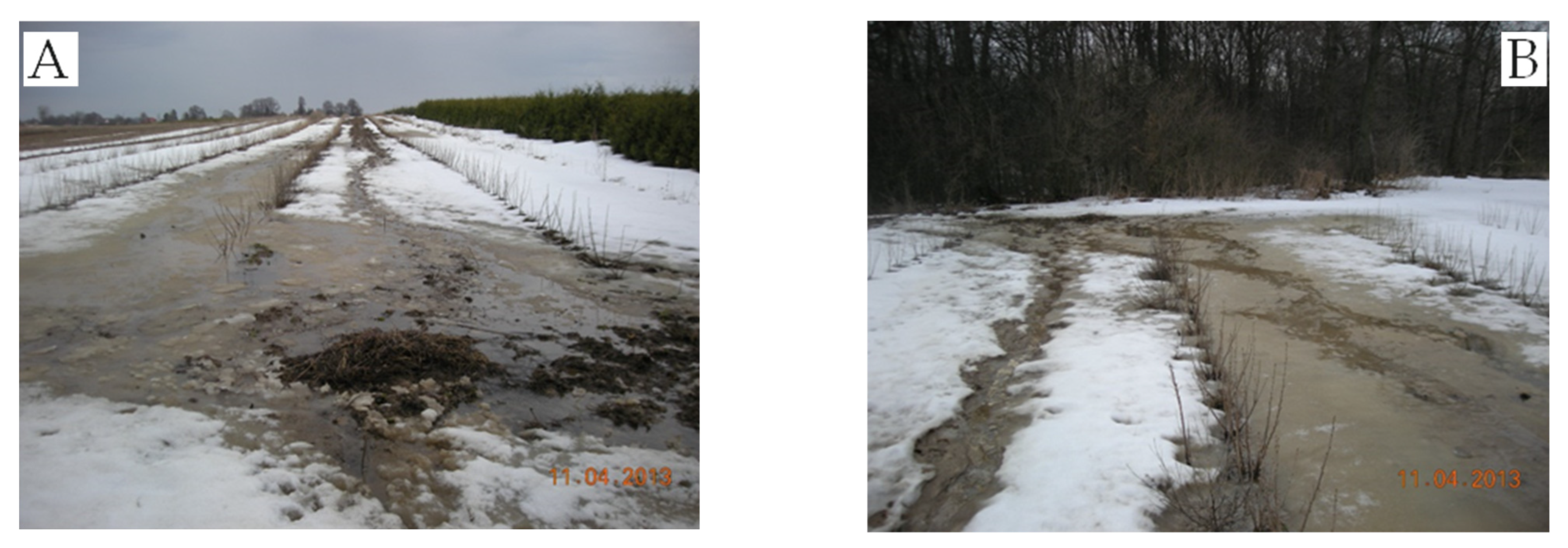 Figure 16. Delivery of snowmelt material in the axis of the main runoff to the main gully (A) and the slope runoff blocked on the edge of the side gully at the field–forest border (B). Photos taken by J. Rodzik.