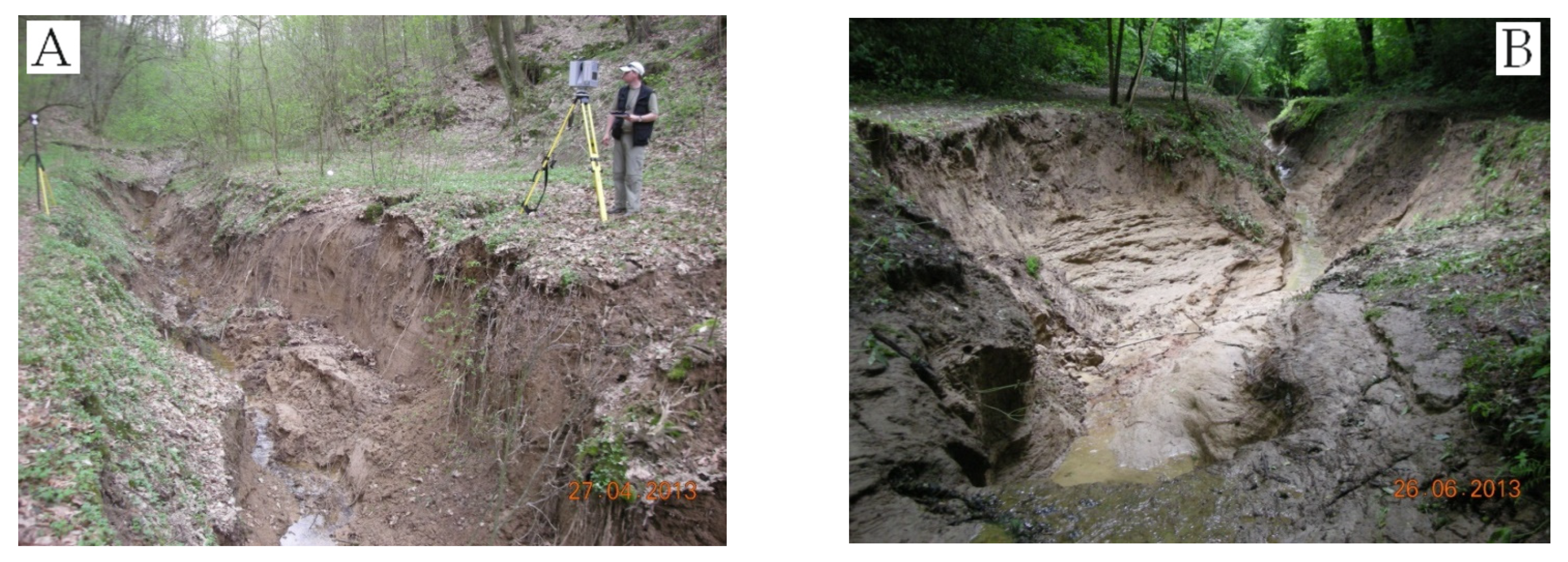 In addition, the area of the gully catchment uncut by gullies is also an important source of material for the gully system [30]. However, the most commonly identified feeding areas in a gully catchment are the gully bottom and gully head. The main sources of slope material and pathways in the gully system are activated during intensive water runoff, which effectively dissects the gully bottom and causes an increase in gully volume and gully head expansion [12,17,18,19]. Nevertheless, it is important to empirically quantify the amount of material delivered directly from the slope subcatchment area to the gully system. The connection between slopes and gully systems during extreme events and the share of soil erosion products carried out of the gully catchment area also require attention. However, there is a lack of quantitative assessments of this material contribution to the erosion balance as the usually old and forested gully systems are generally inactive and only have episodic runoff, which makes monitoring studies difficult.