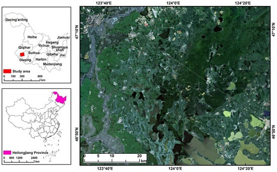 The study area is situated in the northeastern Songnen Plain of Heilongjiang Province, China (123°32′54″ E–124°27′38″ E, 46°43′59″ N–47°14′32″ N), covering an area of 3944.8 km2 (Figure 1). This region has a temperate continental monsoon climate, featuring distinct seasonal variations, an average annual temperature of 3.8 °C, and an annual precipitation of 404.7 mm. The Zhalong wetland, designated as a Ramsar Wetland of International Importance, is situated in the northeastern part of the study area [62]. This zone is characterized by freshwater marshes, shallow lakes, and streams, which provide critical habitats for migratory birds. The dominant plant species in the Zhalong wetland are Phragmites australis and Carex (including Carex pseudocuraica, Carex meyeriana, and Carex enervis), with additional hydrophilous vegetation present [3,57]. The study area is characterized by a complex wetland ecosystem, where marsh wetlands serve as the predominant land cover type. Other significant wetland types include lakes, rivers, and areas that are periodically or seasonally inundated, supporting herbaceous and shrub vegetation. In addition, rice paddies, as a type of constructed wetland, are one of the most extensively distributed wetland types and are typically situated near rivers. The study area also includes non-wetland types, including dryland, meadow, trees, residential areas, and barren areas.