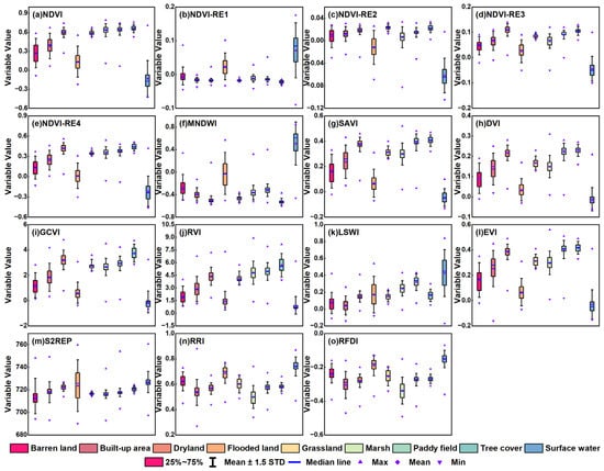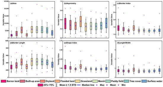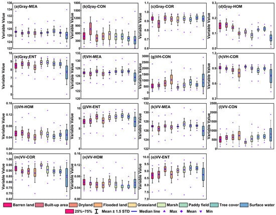 Wetland types are characterized by high soil moisture content, coverage of diverse vegetation types, and shallow water cover. Considering the wetland types in the study area, we chose abundant features to comprehensively reveal as much wetland characteristic information as possible based on previous studies [17,56,73]. Therefore, the object-based feature set includes spectral reflectance variables, microwave backscatter intensity variables, index variables, geometry variables, and texture variables. Specifically, spectral reflectance variables are extracted from Sentinel-2 images, covering a wavelength range from 443 nm to 2190 nm (i.e., Aerosols (443 nm), Blue (490 nm), Green (560 nm), Red (665 nm), RE1 (705 nm), RE2 (740 nm), RE3 (783 nm), NIR (842 nm), RE4 (865 nm), Water Vapor (940 nm), SWIR1 (1610 nm), and SWIR2 (2190 nm)). Microwave backscatter intensity variables are extracted from Sentinel-1 images (i.e., VH, VV), which were sensitive to water or soil moil moisture information [3,10,74]. Geometry variables describe the extent and shape characteristics of segmented objects, including area, asymmetry, border length, border index, shape index, and length to width ratio. Texture variables, including mean (MEA), contrast (CON), correlation (COR), homogeneity (HOM), and entropy (ENT), are generated using the Gray Level Co-occurrence Matrix (GLCM) algorithm from VV, VH and a gray band [75]. The gray band is calculated as a linear combination of the NIR, Red, and Green bands from the original Sentinel-2 images [76,77]. The calculation formulas for different indices are presented in Table 1. Moreover, the statistical plots of spectral and microwave variables, index variables, geometry variables, and texture variables are presented in Figure 2, Figure 3, Figure 4 and Figure 5, respectively. The greater the characteristic differences among ground features, the more it benefited their identification.