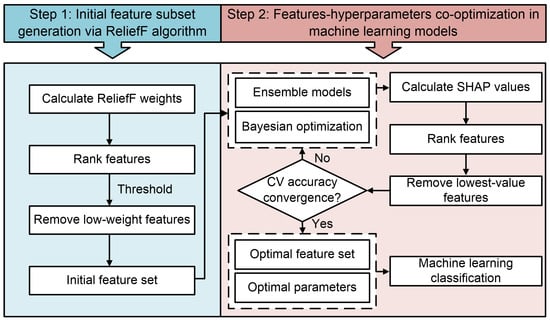 Compared to the ReliefF method, the recursive feature elimination (RFE) algorithm offers a dynamic approach for assessing feature importance. RFE iteratively removes the least relevant features based on the weight coefficients derived from an external estimator. The algorithm begins by using the full set of features to train a specified estimator. Subsequently, the least important features that contribute minimally to the given estimator are removed. The process is repeated recursively on the pruned feature sets until the target number of features is reached [66,67].