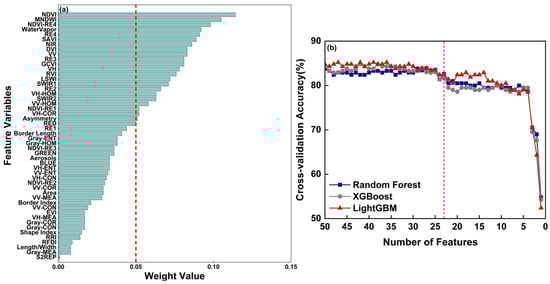 Feature ranking and cross-validation accuracy of models based on ReliefF method. (a) Feature ranking; (b) Cross-validation accuracy of RF, XGBoost, and LightGBM models. The pink line represents the accuracy where the number of features is 23.