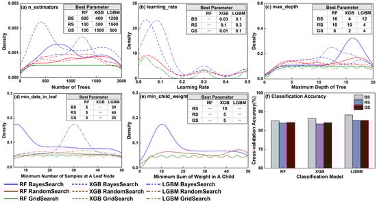 Figure 8a–e show kernel density estimate curves for various hyperparameters. The best parameters for the various machine learning algorithms differed significantly depending on the tuning method. Bayesian optimization identified the best parameters from the frequently occurring hyperparameter values within the domain space. Although random search found some frequently occurring hyperparameter values, it determined the best parameters randomly, which might fall outside of the high-probability range. With grid search, the probability of the occurring parameter values was uniformly distributed. As illustrated in Figure 8f, the RF, XGBoost, and LightGBM models, with hyperparameter tuning via Bayesian optimization, achieved the highest cross-validation accuracy (85.2–88.3%). The accuracy of models optimized through grid search method was slightly higher than that of models optimized using random search.