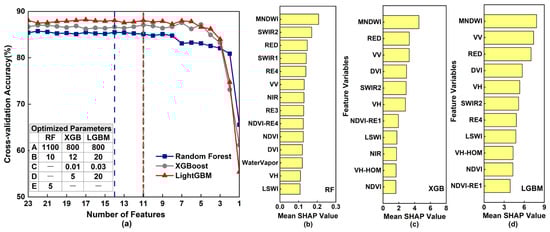 Cross-validation accuracy of RF, XGBoost, and LightGBM models with RFE feature selection based on SHAP importance. The blue, red, and gray dashed lines in panel (a) indicate the optimal number of features. A–E represent the parameters ‘n_estimators’, ‘max_depth’, ‘learning_rate’, ‘min_data_in_leaf’, and ‘min_child_weight’, respectively. (b) represents the variables selected for the RF model; (c) represents the variables selected for the XGBoost model; (d) represents the variables selected for the LightGBM model.