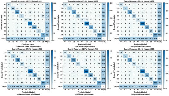 Confusion matrix for pixel-based and object-based RF, XGBoost, and LightGBM classification. C1 to C9 are the class codes representing barren land, built-up area, dryland, flooded land, grassland, marsh, paddy field, tree cover, surface water, respectively. (a–c) represent the confusion matrix of objected-based RF, XGBoost, and LightGBM classification, respectively; (d–f) represent the confusion matrix of pixel-based RF, XGBoost, and LightGBM classification, respectively.