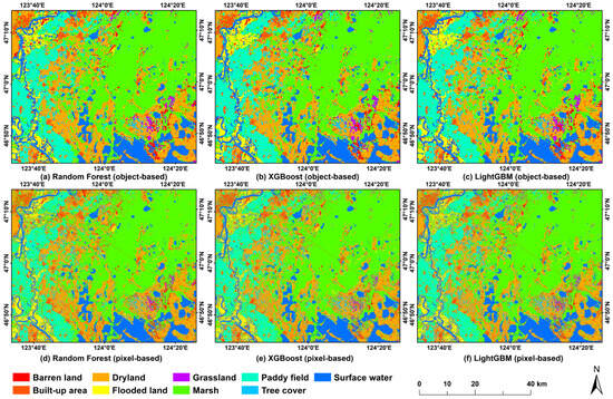 Classification maps generated by the pixel-based and object-based RF, XGBoost, and LightGBM models. (a–c) represent the classification maps of objected-based RF, XGBoost, and LightGBM models, respectively; (d–f) represent the classification maps of pixel-based RF, XGBoost, and LightGBM models, respectively.