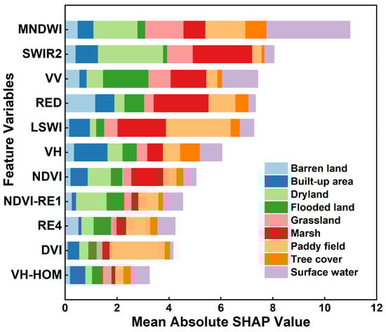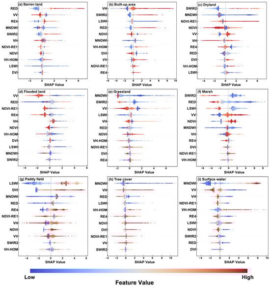 As shown in Figure 10b–d, the optimized features and their importance scores (represented by mean SHAP values) differ among the various models. This demonstrated the importance of selecting features based on the specified algorithms. Several variables with high importance scores were frequently selected from the 23 initial features across all three models, including MNDWI, RED, VV, SWIR2, DVI, VH, LSWI, and NDVI. Furthermore, other features (RE4, NIR, NDVI-RE1, and VH-HOM) also demonstrated high importance in two of the models.