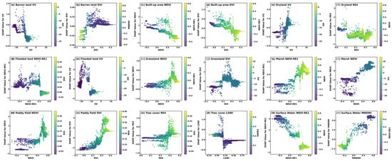 SHAP values were used to interpret the model, providing a deeper understanding of the contribution of various features to wetland classification. Figure 13 displays the mean absolute SHAP values for optimal features across different land cover types in the LightGBM model, ranked by feature contributions. Figure 14 shows the SHAP values of individual samples to reveal the feature contributions. The blue and red points represent the lower and higher feature values, respectively. The horizontal position reflects whether a feature positively or negatively influences the classification results. A wider color region indicates that the feature has a greater influence on the classification results. As shown in Figure 13 and Figure 14, the SHAP values provide global and local explanations for the model’s output. For each class, Figure 15 presented the feature pairs with the most significant interactivity. In terms of wetland types.