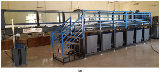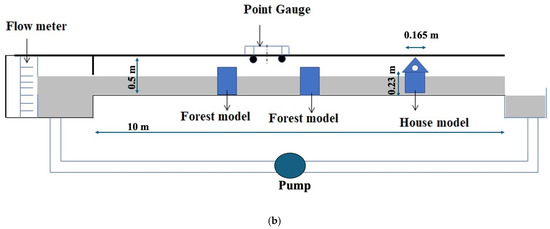 Laboratory experiments were conducted in the glass-sided computerized channel at the Water Resources Laboratory of the Civil Engineering Department, University of Engineering and Technology, Taxila. The channel has specific dimensions: it is 0.31 m wide, 0.5 m deep, and 10 m in length, as illustrated in Figure 1a,b. The channel’s discharge was measured using a flow meter installed on the upstream side of the channel, as depicted in the diagram. The flow velocity was controlled by a pump speed controller located at the upstream end of the channel. Water depth was measured using a point gauge integrated within the channel. These experiments were designed to represent general ground and flood conditions and were not tied to any specific geographical location.
