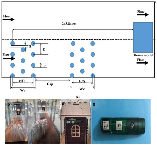 Eucalyptus tree species were selected for this study. At a 1:100 scale, the model represents prototype trees with a height of 7.6 to 14.6 m and a trunk diameter of approximately 0.11 to 0.3 m. To maintain geometrical similarity metal rods of 0.003 m (0.3 cm) at a scale of 1:100 was used which is a standard practice for representing solid, non-flexible tree trunks in physical hydraulic models [8,9]. The cylinders were arranged in two patches at various orientations (30°, 45°, 60°, and 90°) relative to the flow direction, covering half the width of the flume, as shown in Figure 2a. Experiments were conducted for seven Froude numbers within the range of 0.18–0.25. Various orientations of the vegetation were examined, as shown in Figure 2b,c. Initially, both vegetation and building models were placed perpendicular to the flow, and experiments were conducted under these conditions. Subsequently, the vegetation angle was adjusted to 90°, 60°, 45°, and 30° for each orientation, and experiments were conducted across all scenarios [9]. The acceleration of the building model, installed on the downstream, was measured by attaching an X2-2 accelerometer to the physical model structure, as shown in Figure 2d. The test building was rectangular, simulating a scaled-down physical model of a house also at scale, with dimensions of 16.5 cm in length, 15.5 cm in width, and 23 cm in height. This corresponds to a genuine building with dimensions of 742 cm in length, 698 cm in width, and 1035 cm in height.
