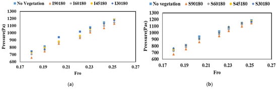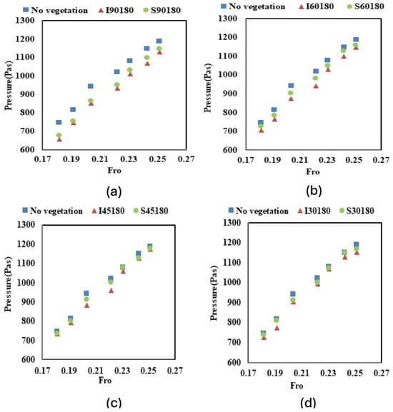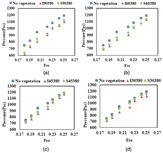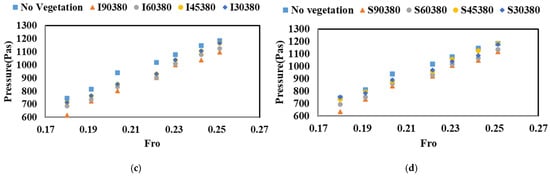 Experiments were conducted to determine the effect of different angles of vegetation placement. Figure 6a–d depicts the hydraulic pressure force versus Froude numbers for four various vegetation orientations (90°, 60°, 45°, 30°) and in the absence of vegetation. It demonstrates that decreasing the vegetation angle raises the hydraulic pressure upstream. The hydraulic pressure was found to be greatest in the absence of vegetation and lowest in an arrangement with vegetation at a 90° orientation. By increasing the orientation of the vegetation patch relative to the flow, more obstruction is provided by the vegetation. Perpendicular vegetation offers increased resistance to water flow, thereby reducing the water depth on the upstream face of the building model. Consequently, the fluid pressure force decreases. Maximum hydraulic pressure force reduction observed for I90380 (with vegetation in intermediate arrangement), and minimum pressure force reduction observed for the case without vegetation.