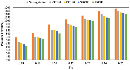 The effect of vegetation density and patch orientation on pressure force for various Froude numbers for the case of 90° orientation of the patch to the main flow direction.