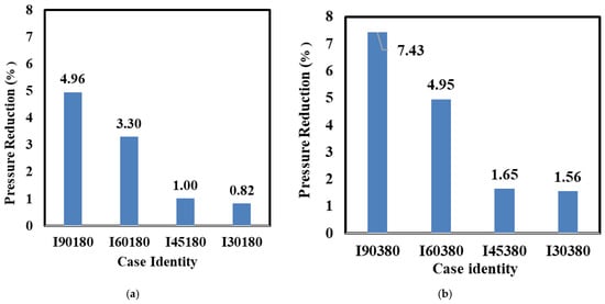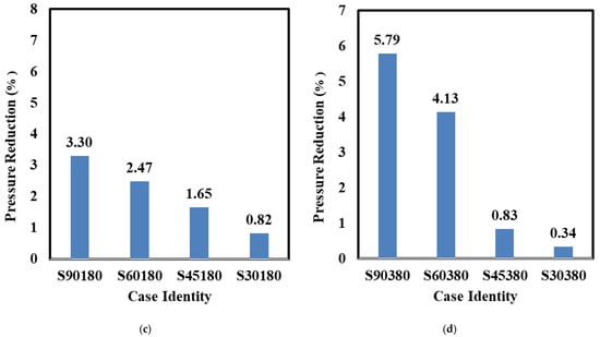Figure 7 quantifies the percentage reduction in hydrostatic pressure for both intermediate (a,b) and sparse (c,d) vegetation configurations. The results demonstrate that vegetation density and orientation significantly influence performance. The maximum pressure reduction of 7.43% was achieved using the intermediate-density vegetation at a perpendicular orientation (I90380), while the minimum reduction of 0.82% occurred with intermediate vegetation at a 30° orientation (I30180). Similarly, sparse vegetation exhibited a maximum reduction of 5.79% at 90° (S90380) and a minimum reduction of 0.34% at 30° (S30380). These findings underscore the critical importance of both vegetation density and alignment, with perpendicular arrangements consistently yielding superior flow resistance and energy dissipation across all density conditions.