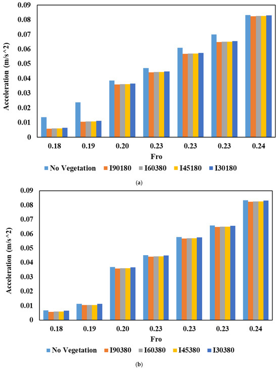 Figure 8a,b presents a comparative analysis of model acceleration reduction across vegetation densities (dn = 180 and dn = 380) and orientations (90°, 60°, 45°, 30°). The bar graphs demonstrate that vegetation significantly reduces structural acceleration compared to non-vegetated conditions, with perpendicular (90°) orientations yielding the highest dissipation across both densities. This superior performance is attributed to the greater flow resistance and energy dissipation capacity of denser vegetation patches. The results underscore the combined importance of vegetation density and orientation, confirming that optimal flood protection requires both high-density planting and perpendicular alignment to flow direction. These findings provide critical insights for designing nature-based flood mitigation systems that effectively safeguard infrastructure. Similar trends were observed for sparse vegetation cases that is why only intermediate vegetation cases are presented in Figure 8a,b.
