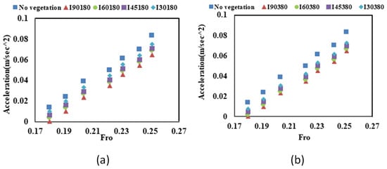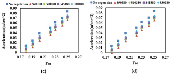 Demonstration of the effect of Froude number on the acceleration of the model structure for different orientations relative to the main flow direction for: (a) intermediate vegetation density and dn = 180, (b) intermediate vegetation density and dn = 380, (c) sparse vegetation density and dn = 180, and (d) sparse vegetation density and dn = 380.