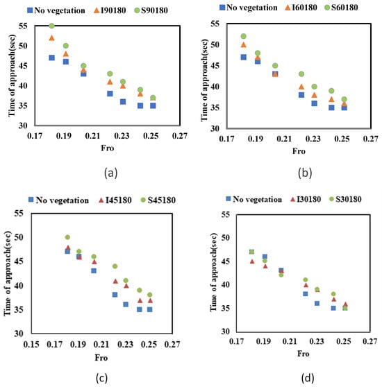 The time of approach for vegetation thickness dn = 380 in sparse arrangement against various Froude number were 37–55 s for S90380, 37–52 s for S60380, 38–52 s for S45380, 35–47 s for S30380. Similarly, the time of approach for intermediate vegetation having thickness dn = 380 against four different vegetation angles S90380, S60380, S45380, S30380 and was 47–60 s, 48–57 s, 41–52 s and 42–49 s as shown in Figure 10a–d. The maximum time delay was 1 min for I90380, i.e., time of approach increases 21.66%.