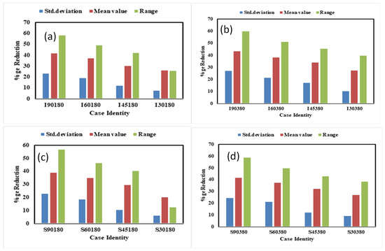 Vegetation proves to be a highly effective method for mitigating flood damage and reducing hydraulic pressure. In a rectangular channel, we conducted investigations into the impact of vegetation at various angles relative to the flow direction [2,4]. The resistance offered by vegetation arrangements to the passage of flow influences flow hydraulics, including the water surface profile within the forest, which directly affects the structural accelerations beyond the forest [1]. Figure 11a–d presents the percentage reduction in key statistical parameters, i.e.; standard deviation, mean, and range for both intermediate and sparse vegetation configurations across four alignment angles (90°, 60°, 45°, and 30°). The results demonstrate that vegetation significantly improves pressure dissipation consistency, with the perpendicular (90°) orientation yielding the highest reduction in statistical variability for both densities. Intermediate vegetation (e.g., I90) consistently outperforms sparse arrangements (e.g., S90), achieving greater reductions in all statistical measures due to its enhanced flow resistance and pressure dissipation capacity. This underscores the role of denser vegetation not only in mitigating peak hydrodynamic loads but also in stabilizing flow conditions, reducing uncertainty in flood impact predictions.