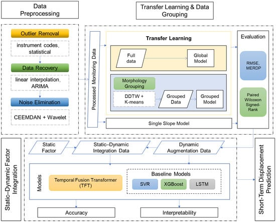 This section outlines the methodological framework for short-term landslide displacement prediction, which integrates both static and dynamic factors. The framework consists of three main components: data preprocessing, transfer learning, and static–dynamic factor integration. A detailed workflow of the proposed approach is illustrated in Figure 2.