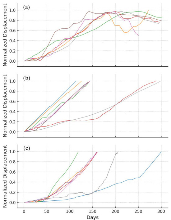 Landslide morphology-based classification produced three distinct categories. To maintain clarity and avoid visual clutter, a representative subset of curves was randomly selected from each category for visualization (Figure 4). These representative curves are labeled according to their morphological features as stepwise displacement (97 cases, 35%), constant-velocity displacement (136 cases, 50%), and accelerated displacement (41 cases, 15%), a classification broadly consistent with previous studies [11,12].