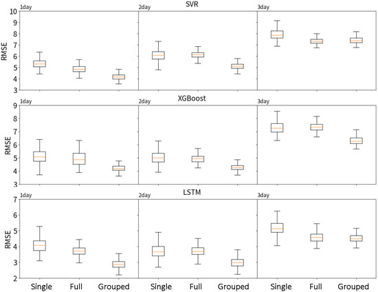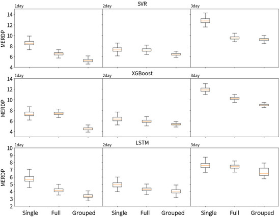 To validate the grouped prediction approach, we compared its performance against a single-slope dataset and an enhanced ungrouped full-slope dataset. Displacement forecasts with a three-day horizon were generated using SVR, XGBoost, and LSTM models. Correlation analysis supported the use of 15 days of historical rainfall and displacement as input variables. The effectiveness of the grouped data enhancement method was evaluated based on predictive accuracy across different models and forecast horizons. Box plots of RMSE and MERDP for the three datasets are shown in Figure 5 and Figure 6, respectively, demonstrating that the grouped enhancement approach generally reduces prediction errors and improves model precision.