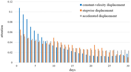 The temporal attention distribution of the constant-velocity displacement group differs markedly from the other two groups. In this group, attention declines sharply with time, indicating that the model relies mainly on short-term information and is relatively insensitive to longer-term data. By contrast, the stepwise and accelerated displacement groups display a more gradual decline in attention, followed by a moderate recovery that peaks around day ten. These patterns suggest that displacement in the constant-velocity group has only a weak correlation with historical rainfall, whereas displacement in the stepwise and accelerated groups is more strongly influenced by precipitation.
