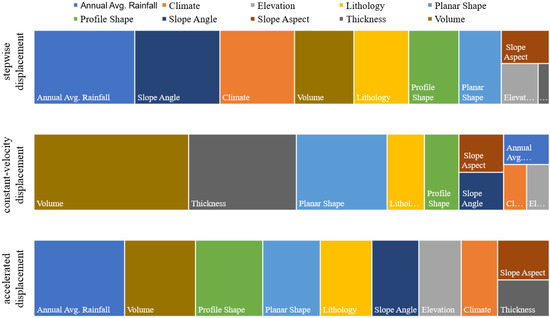 Figure 9 illustrates the relative importance of static variables across different landslide groups. In the stepwise and accelerated displacement groups, annual mean precipitation emerges as the dominant driver, whereas in the constant-velocity group, landslide volume exerts the strongest influence. The results indicate that rainfall remains a primary trigger for rainfall-induced landslides. Among the top five most influential static factors in the accelerated displacement group, all variables except annual precipitation also appear in the top five of the constant-velocity group, highlighting that rainfall is the key factor driving the transition from stable to accelerated displacement. Moreover, the findings underscore the critical role of slope-inherent attributes in understanding landslide dynamics. Notably, four static variables, volume, planar, profile, and lithology, consistently rank among the top five factors for both the accelerated and constant-velocity groups, indicating that these background geological characteristics provide essential context for slope stability [48,49] and significantly enhance predictive model performance. At the same time, volume and lithology remain highly influential across all groups, reflecting the persistent impact of slope geometry [50,51] and mass on displacement behavior, consistent with the conclusions of previous mechanistic studies on landslides [52,53].