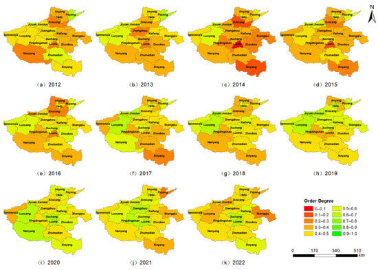 The order degrees of water source systems in 18 prefecture-level cities of Henan Province from 2012 to 2022 were computed, as shown in Figure 7 and Figure 8 and Table S4.