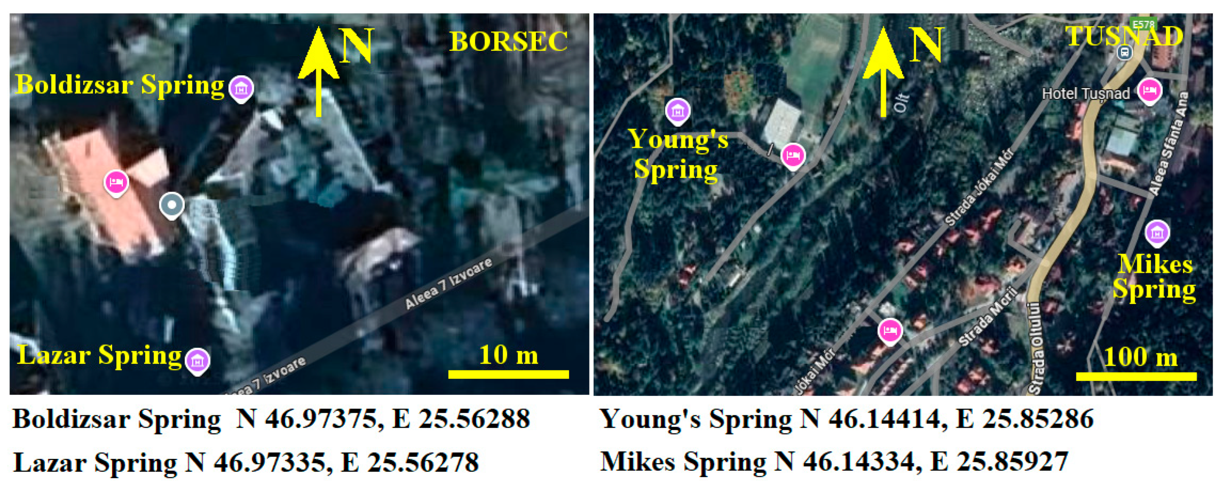 - Borsec Public Springs Composition Declaration Displayed on the Entrance Front, National Mineral Water Company of Romania. Available online: https://www.snam.ro/ (accessed on 21 February 2024).