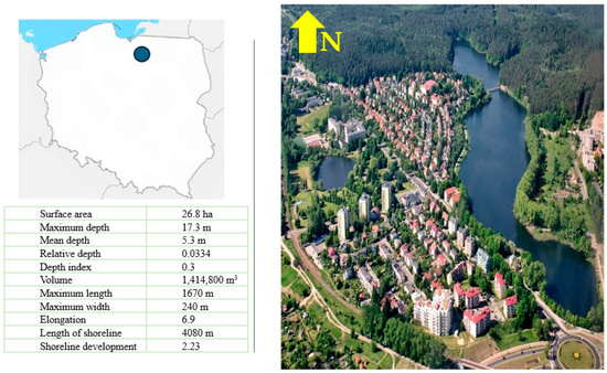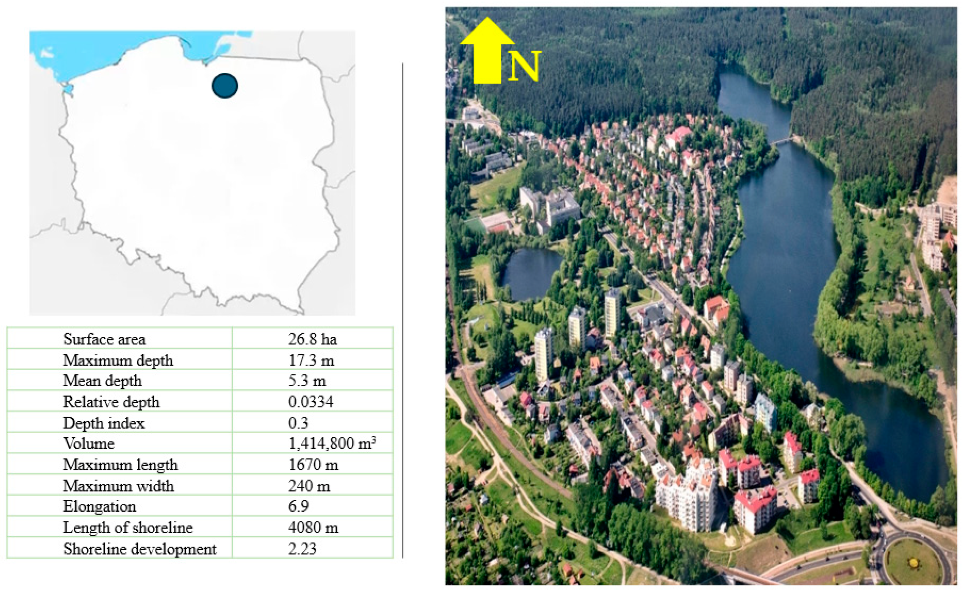 2/L) were recorded in the lake. Parameters indicating the level of primary production, such as chlorophyll a (500 µg/L), the overoxygenation of surface water layers (290%), and low water transparency—0.2 m—were also recorded in the lake. Raw sewage flowing into this reservoir also harmed the biodiversity of the ecosystem. According to Rodziewicz and Rybak [