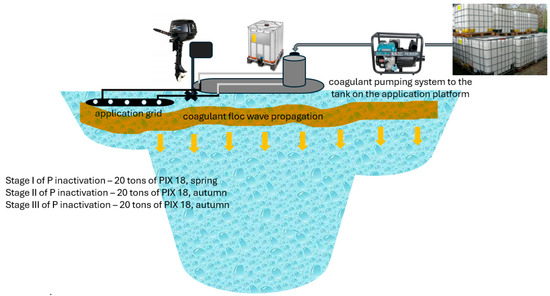 Then the decision was made about using a supporting method—phosphorus inactivation, which is based on the precipitation of phosphorus from the water column and blocking it in the deposits. Coagulant application (salts of metals binding phosphorus) improves the sorptive properties of sediment. Because aluminum is an element that forms a durable bond to P, even in anoxic conditions and with a low redox potential, it was decided to apply to DL the Al coagulant PAX 18 (polyaluminum chloride, which contains ca. 9% Al).