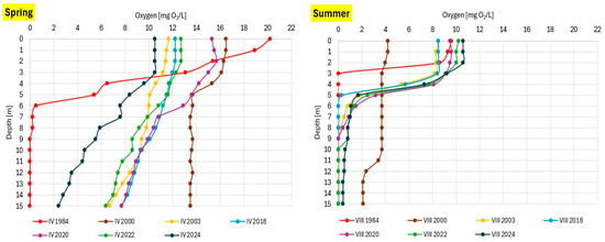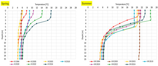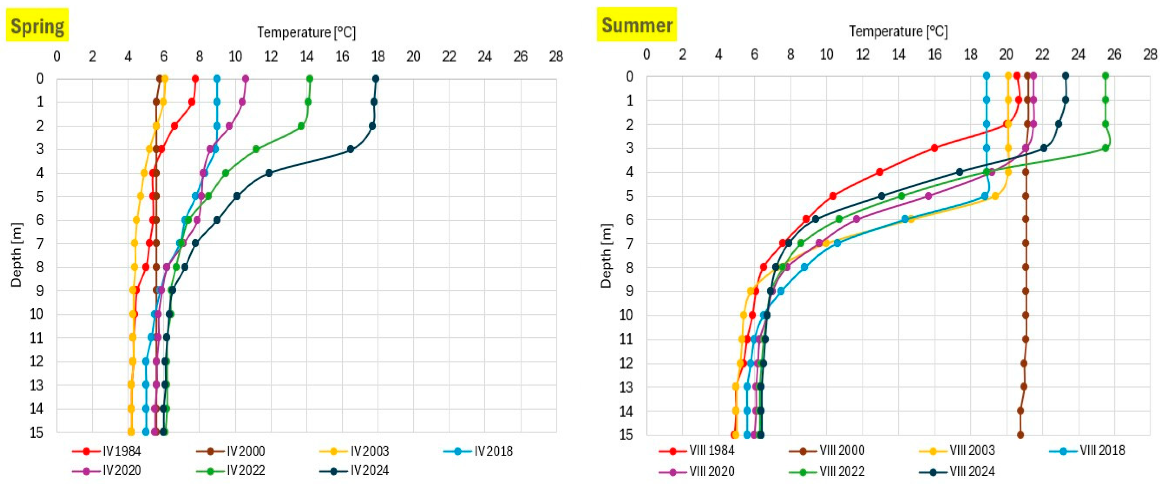 Figure 4). Deeper, the temperature dropped rapidly, reaching 4.2 °C at the bottom in 1984 and 2003, and approximately 6 °C in 2022 and 2024.