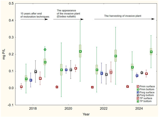 Figure 6). When the presence of invasive plants was noted (2020), the mean values decreased to 0.007 ± 0.003 mg P/L in the upper water layer and increased to 0.108 ± 0.079 mg P/L near the bottom. In the following research years, a small increase in phosphorus amounts, to approximately 0.008 ± 0.002 mg P/L at the surface and up to 0.115 ± 0.005 mg P/L in the over-bottom water (