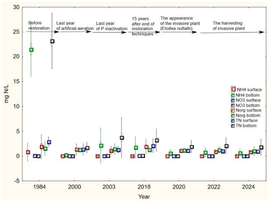 Figure 8). In the next years, the average ammonia concentration at the surface was 0.084 ± 0.069 mg N/L, and at the bottom amounted to 0.683 ± 0.388 mg N/L. Before restoration, the mean content of NO