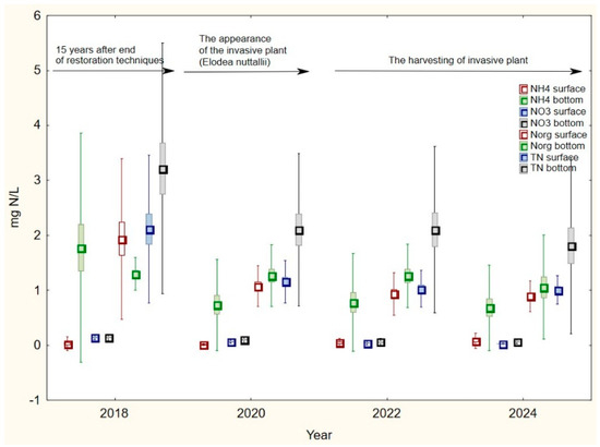 Figure 9) in the upper water layer and 1.29 ± 0.15 mg N/L in the near-bottom layer. After the appearance of invasive plants and after the implementation of their harvesting, a significant decrease in organic nitrogen concentrations was noted with 0.895 ± 0.141 mg N/L in the surface water layer and with 1.06 ± 0.47 mg N/L at the bottom.