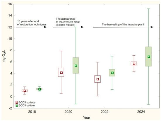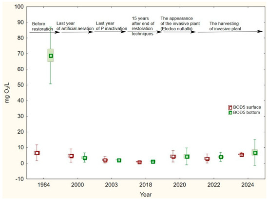 Figure 10). Artificial aeration and P inactivation methods caused a decrease in the primary production processes and a reduction in organic matter content. In 2018, 15 years after the end of restoration and before the invasive plant growth, the mean value of BOD