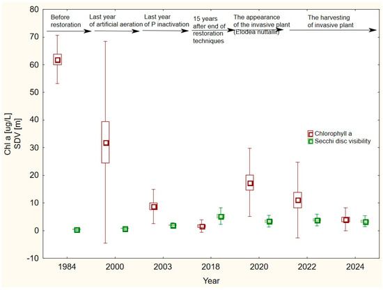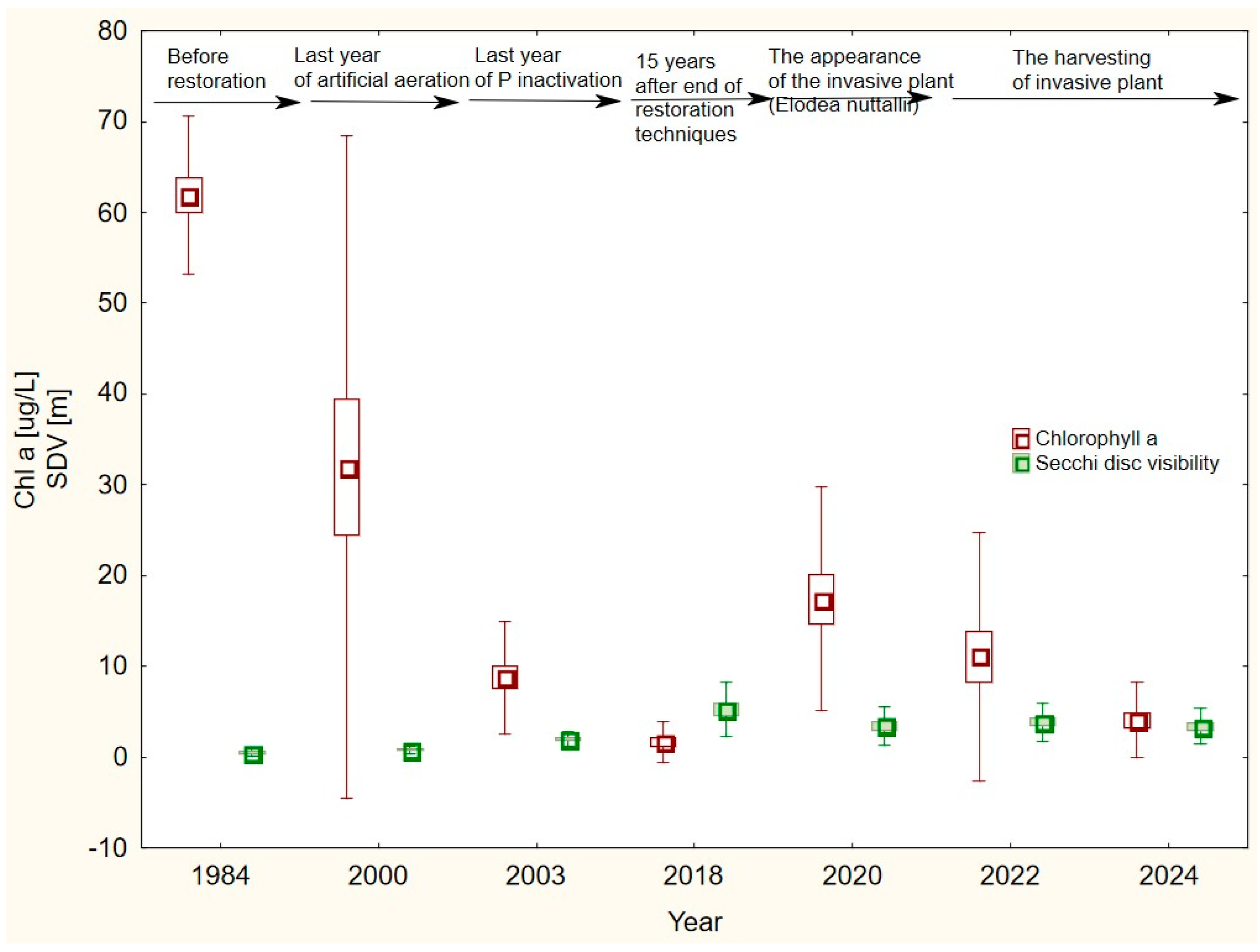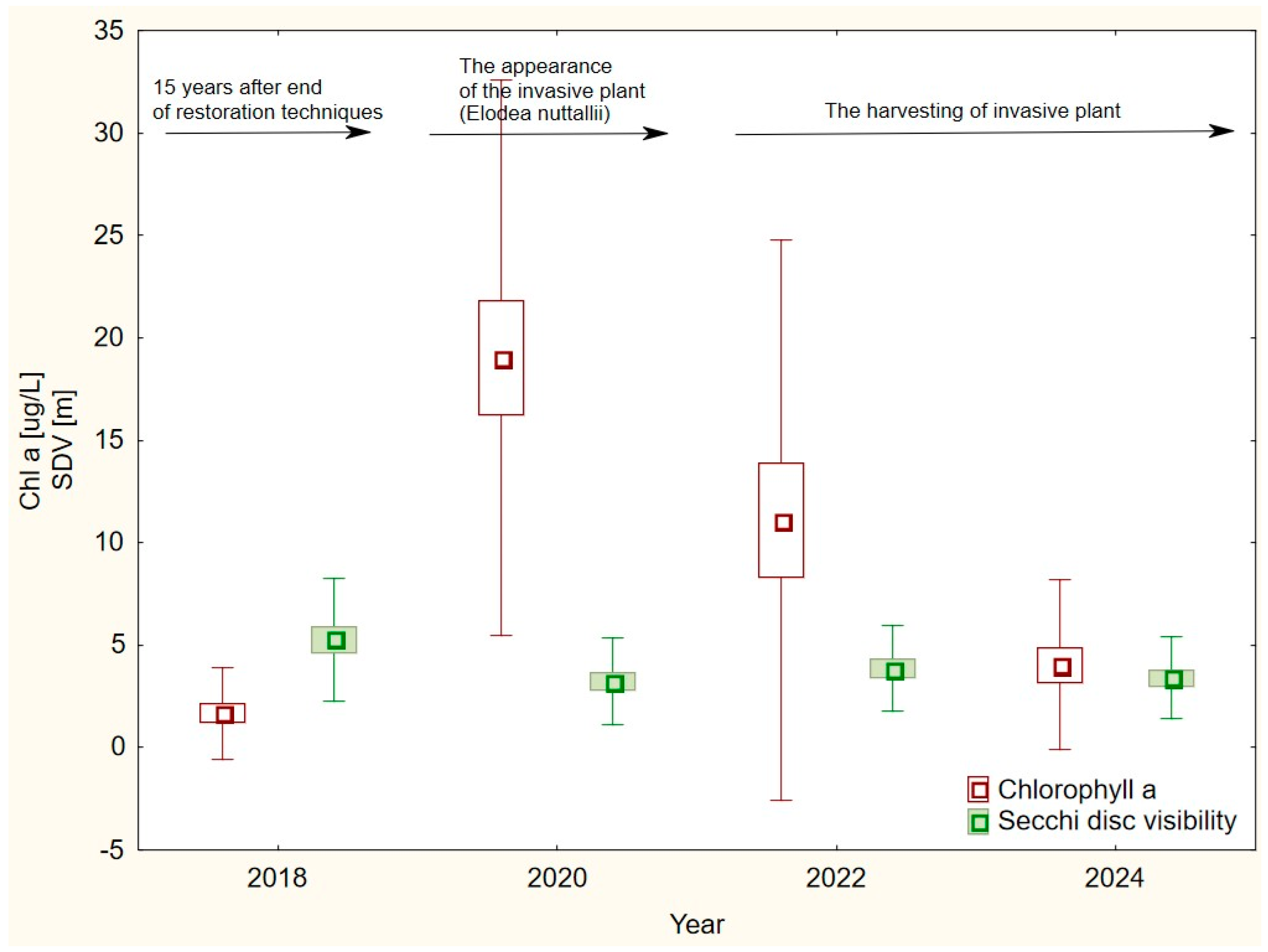Figure 13). The appearance of invasive plants caused an increase in the average content of chlorophyll a to 19.03 ± 6.78 µg/L and a decrease in mean water transparency to 3.2 ± 1.05 m. The subsequent harvesting of plants caused a slight improvement in water transparency to 3.8 ± 1.00 m and a decrease in the average content of chlorophyll a to 4.04 ± 2.07 µg/L (