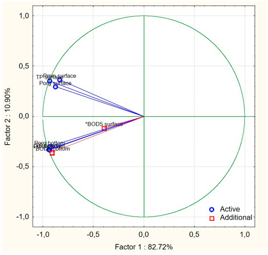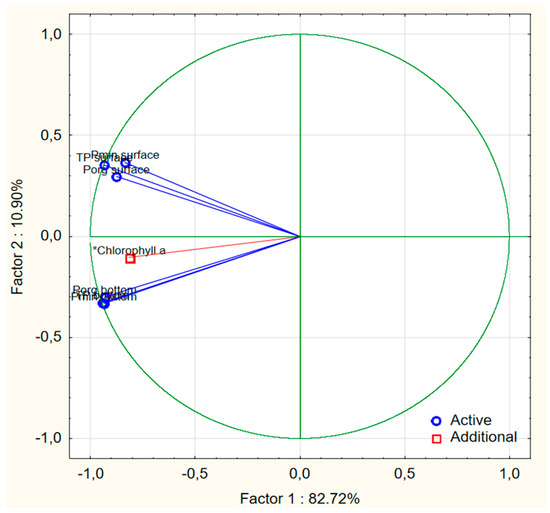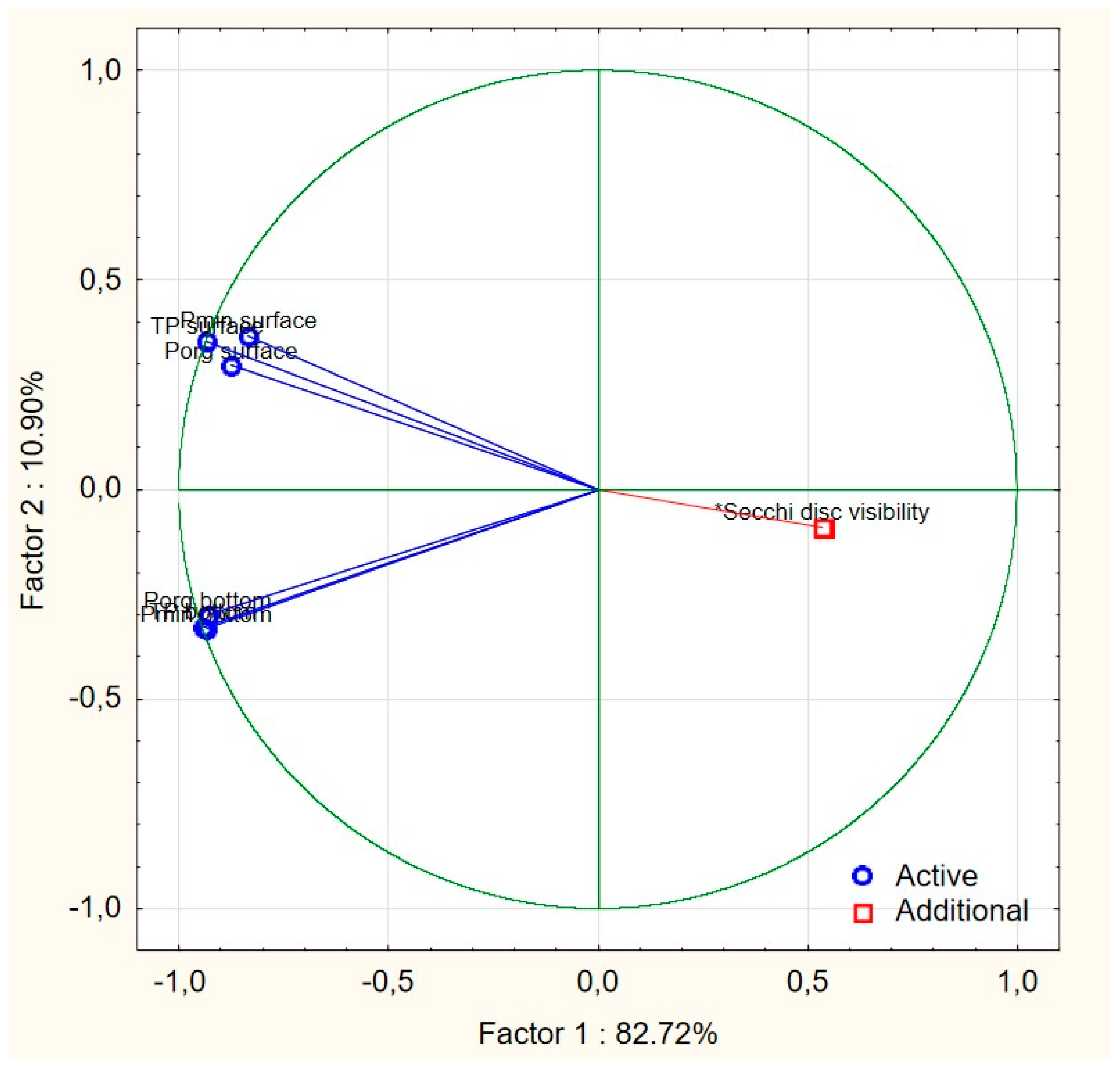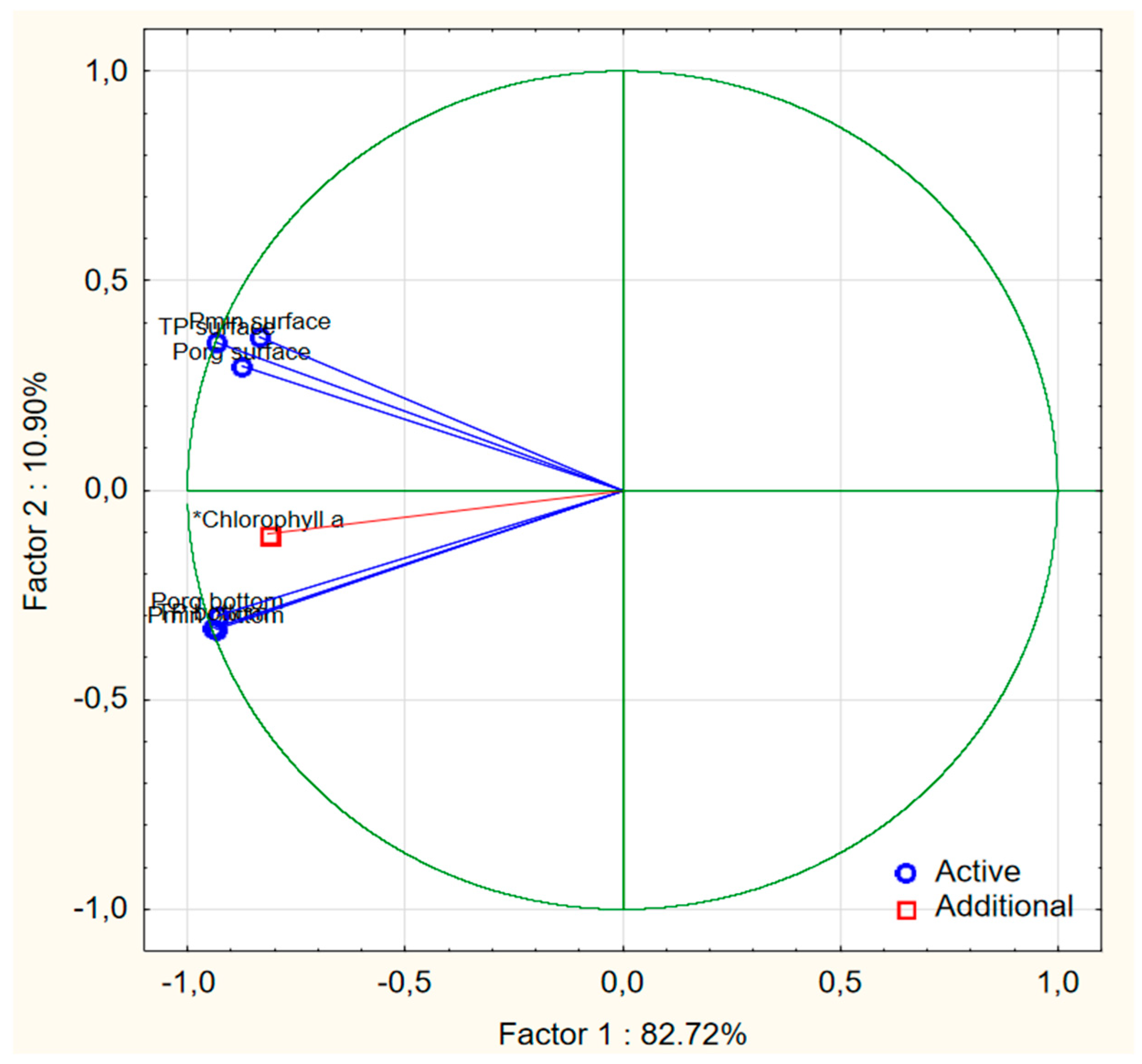 The PCA revealed positive correlations between phosphorus compounds and BOD5 and chlorophyll a, and a negative correlation between phosphorus compounds and water transparency (SD) (