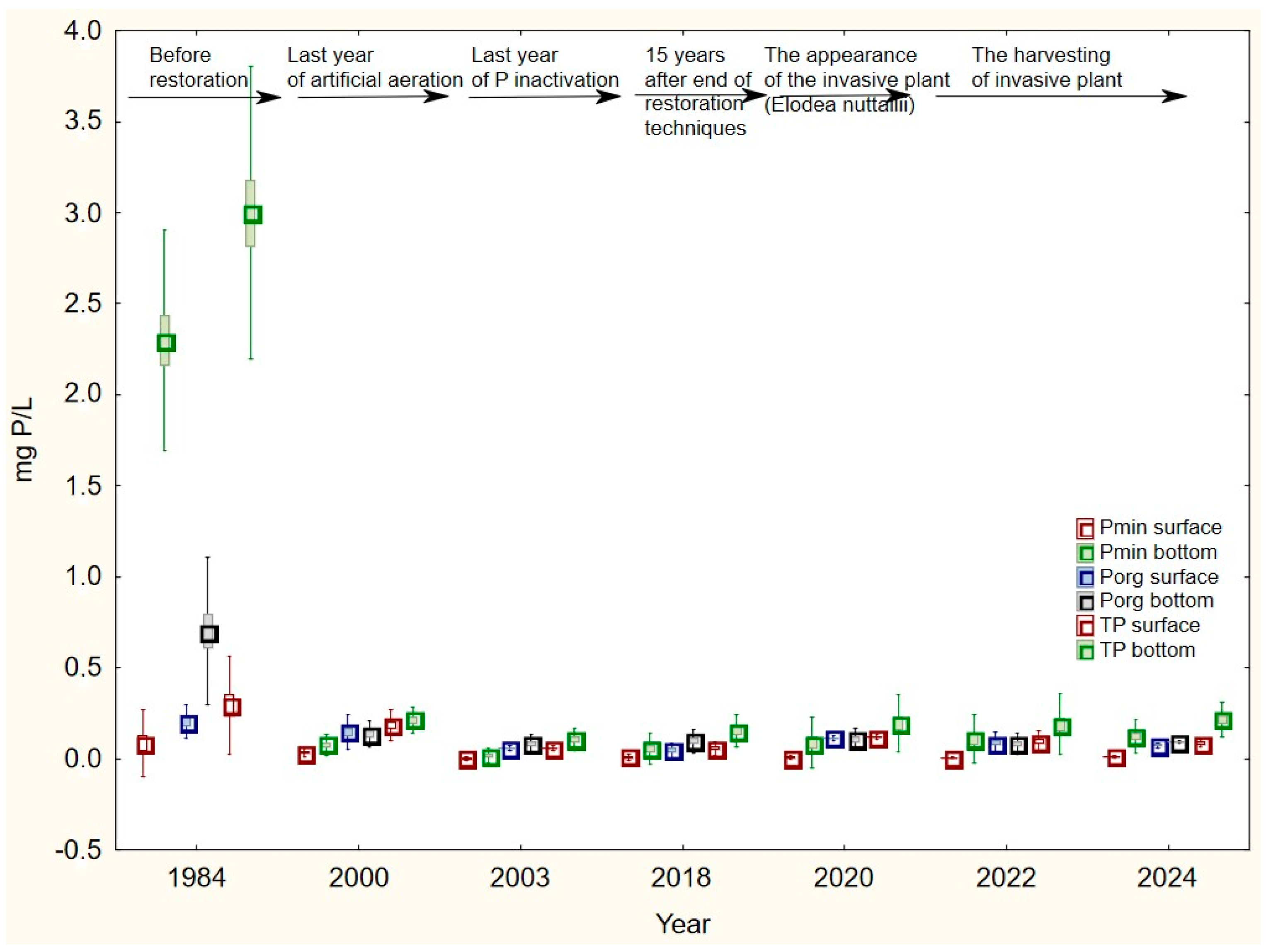Table 1). In 1984, before restoration, the mean TP was 0.279 ± 0.126 mg p/L in the surface water layer and 3.011 ± 0.126 mg P/L in the near-bottom water. The long-term restoration of the lake by artificial aeration and P inactivation caused a very clear improvement of water quality. In 2003, the mean value of TP was 0.059 ± 0.030 mg P/L in the surface water and 0.105 ± 0.006 mg P/L in the near-bottom water. As a result of the massive growth of IAAP, the mean values of total phosphorus in the surface water layer slightly increased from 0.058 ± 0.019 mg P/L (in 2018) to 0.086 ± 0.010 mg P/L (in 2024). Total phosphorus concentrations in the over-bottom water layer increased 1.5 times, from 0.155 ± 0.045 mg P/L (in 2018) to 0.215 ± 0.048 mg P/L (in 2024) (