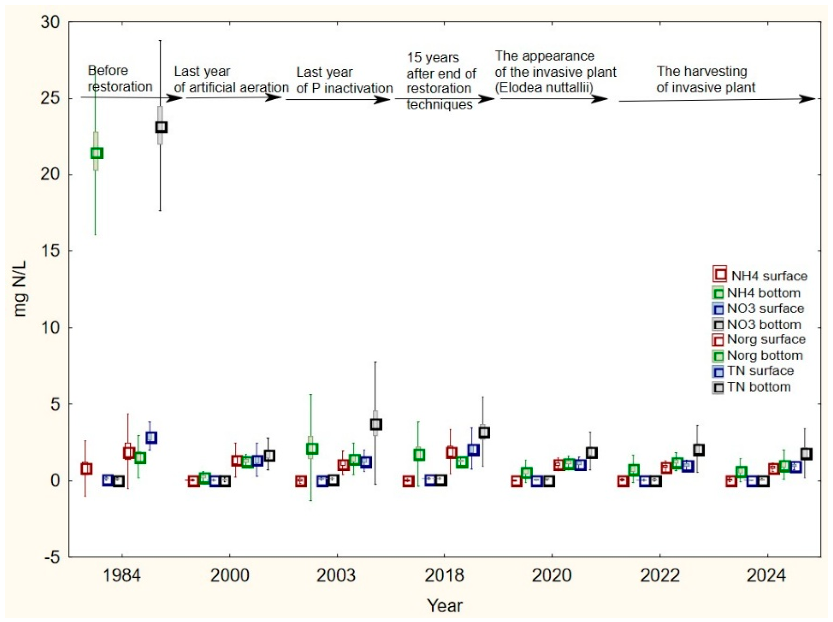 Figure 6). After the completion of the restoration, the average phosphate content in the epilimnion layer was 0.001 mg P/L and the total phosphorus was 0.076 mg P/L. At the bottom, the average phosphate concentration was 0.011 mg P/L and the total phosphorus was 0.059 mg P/L. The studies showed that despite the fact that P inactivation does not directly affect the content of nitrogen compounds, a several-fold decrease in the concentration of total nitrogen was achieved in the lake, which remained at the level of 1.32 mg N/L in the epilimnion and 3.77 in the hypolimnion water (