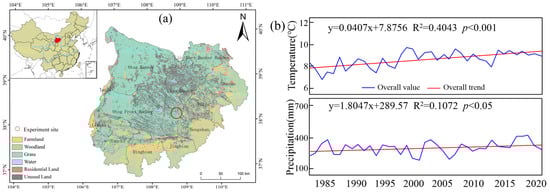 (a) Location of the Mu Us Sandy Land; (b) main meteorological elements trends.