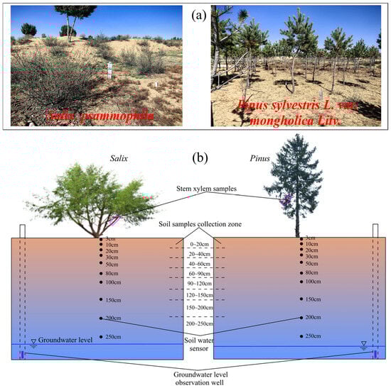 The “Returning Farmland to Forest” project, one of China’s largest afforestation initiatives, aims to reduce soil erosion and improve vegetation cover in the northwest. In this program, Pinus (an exotic tree species) and Salix (a native shrub) have been widely planted for their perceived drought resistance and ecological benefits, contributing significantly to windbreaking and sand fixation [3,30]. However, since the 1990s, Pinus plantations have shown widespread decline, characterized by yellowing branches, poor growth, regeneration failure, and mortality [3,49], raising concerns about the suitability of exotic trees for sand stabilization. A pressing issue is that introduced species often consume excessive water, reducing regional water availability [13]. There is an urgent need to clarify plant–soil water interactions of typical vegetation to quantify water-use patterns and stress responses and inform restoration practices.