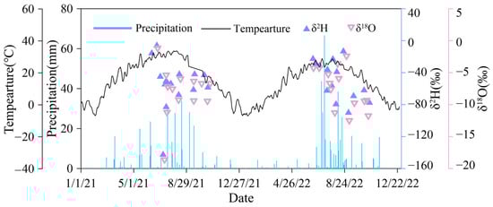 Relationships between the δ2H and δ18O values of precipitation from 2021 to 2022 in the study area.