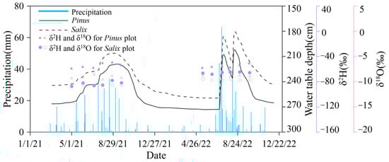 Throughout the study period, groundwater isotopic composition remained relatively stable in each plot (Figure 5). In the Pinus plot, the mean δ2H values were −62.13‰ (range: −66.54‰ to −58.81‰; CV: 0.07) in 2021 and −61.33 ‰ (range: −63.24‰ to −59.09‰; CV: 0.04) in 2022. Corresponding, δ18O values were −8.55‰ (range: −9.77‰, −8.27‰; CV: 0.02) in 2021 and −8.08‰ (range: −8.61‰ to −8.23‰; CV: 0.02) in 2022. In the Salix plot, the mean δ2H values were −75.64‰ (range: −83.8‰ to −70.7‰; CV: 0.08) in 2021 and −66.47‰ (range: −71.74‰ to −60.82‰; CV: 0.06) in 2022. Correspondingly, δ18O values were −10.79‰ (range: −10.71‰ to −9.68‰; CV: 0.06) in 2021 and −9.16‰ (range: −9.77‰ to −8.22‰; CV: 0.05) in 2022. The groundwater isotopic composition remains stable annually due to the aquifer’s large storage capacity, which dilutes the input from individual precipitation events. The significant time lag for infiltration and mixing within the unsaturated zone further blends seasonal isotopic variations into a stable long-term average. This stability is methodologically advantageous, providing a well-defined endmember for mixing models. It allows us to reliably quantify shifts in plant water uptake between shallow soil layers and deeper, stable groundwater sources.