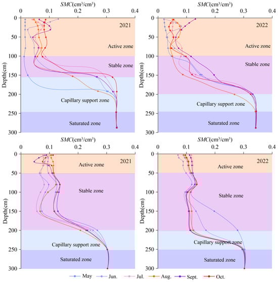 Figure 6 illustrates the spatiotemporal variations in SMC within the Salix and Pinus plots during the study period. The SMC of the two plots exhibited similar characteristics. That is, the SMC above a depth of 50 cm was affected by atmospheric conditions, showing pronounced fluctuations. Meanwhile, the capillary fringe—extending about 50 cm above the water table—was affected by groundwater-level changes. The remaining soil zones remained relatively stable, with variations primarily driven by RWU. Based on these variation characteristics of the SMC, the soil profile was categorized into the active zone, stable zone, capillary support zone, and saturated zone (Figure 6). Among them, the capillary support zone was not interpreted as a static reservoir but as a critical hydrological bridge that connects the saturated zone to the stable zone where the root systems were active.