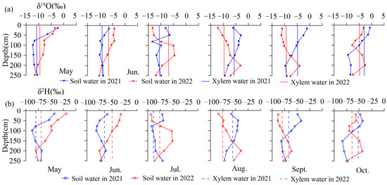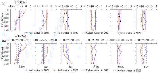 Spatiotemporal distributions of δ2H (a) and δ18O (b) in the Pinus plot during the growing periods of 2021 and 2022.
