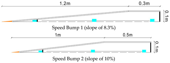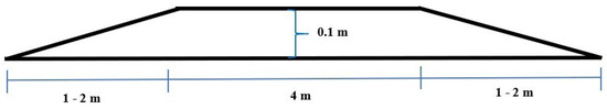 In Spain, national standards for speed bump installation are governed by technical directive Order FOM 3053/2008 [2]. This regulation defines two distinct speed bump designs, one featuring a trapezoidal cross-section (Figure 3) and another with a circular segment profile. The trapezoidal design, which is the predominant type used throughout Spain, requires that the ramp’s horizontal projection measures between 1 and 2 m in length.